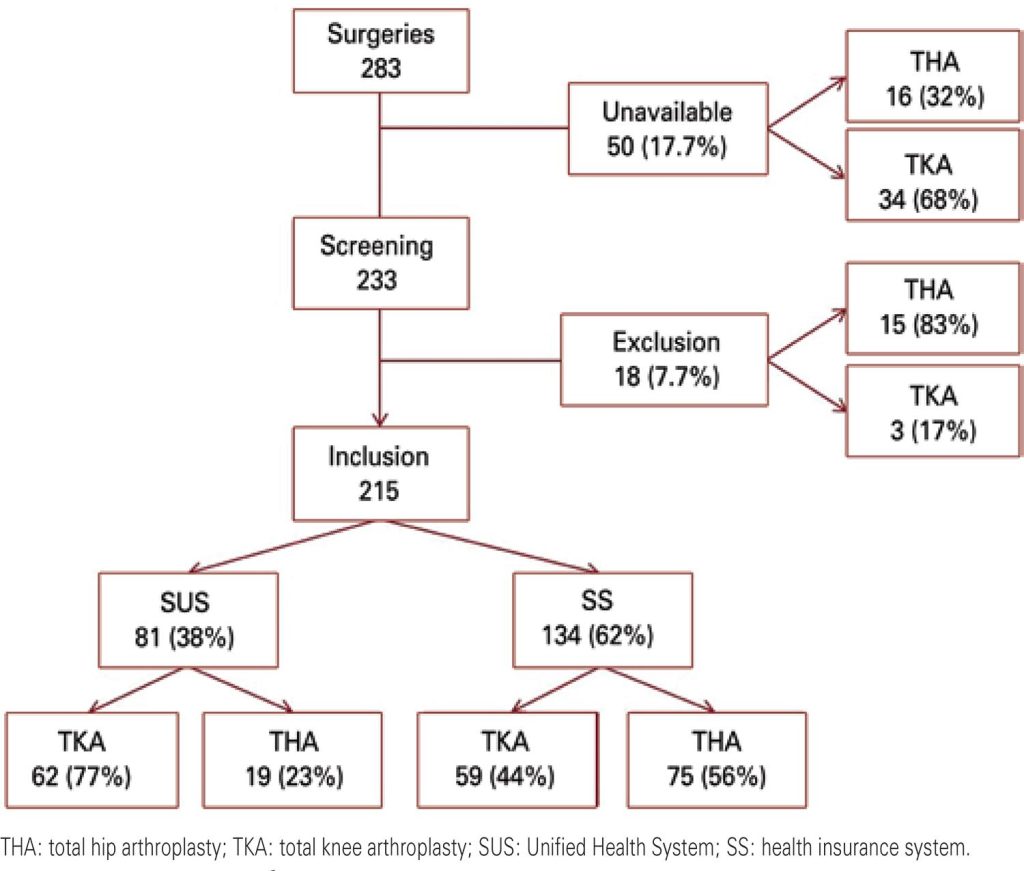 To compare therapy for prophylaxis of venous thromboembolism and costs related to hospitalization of patients undergoing total knee and hip replacement within the context of the Brazilian health system.