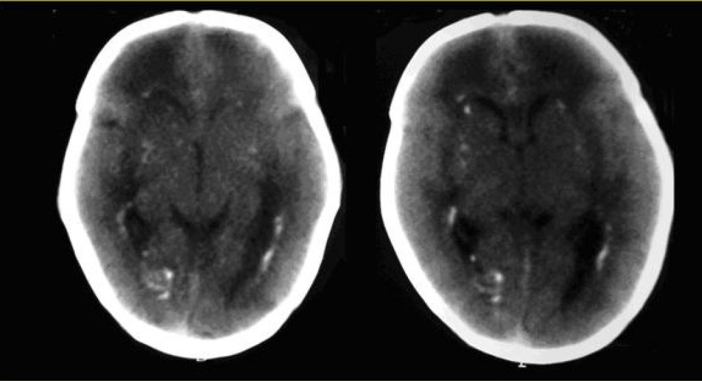 A female infant born at 37 weeks and 2 days of gestation by vaginal delivery was admitted to the neonatal intensive care unit on July 11, 2009 with birth weight of 2,030 g, height of 41,0 cm and head circumference of 31.0 cm. The infant Apgar were 8, 9 and 9 at 1, 5 and 10 min, respectively. A diagnosis of congenital toxoplasmosis was entertained because of the mother clinical history (she IgG positive and IgM positive for toxoplasmosis with avidity of 85% during first trimester of pregnancy). At the first trimester morphology scan intracranial calcifications were seen. The newborn had intrauterine growth restriction, splenomegaly, petechias and thrombocytopenia. Treatment of toxoplasmosis was done with sulphadiazine, pyrimethamine and folinic acid. The tomography of the skull showed multiple foci of bilateral periventricular calcifications and on the base nuclei. Due to these findings the serology for cytomegalovirus of mother and child was ordered. The mother was IgM negative, but IgG positive. The newborn was IgM and IgG positive. Cytomegalic inclusions in newborn’s urine and polymerase chain reaction (PCR) for CMV had positive results. The newborn was discharged and was referred to outpatient clinic to be treated with ganciclovir.