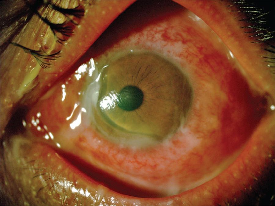 A 39-year-old man, MAFS, was admitted to ophthalmology emergency service of theUniversidade Federal de São Paulo reporting low vision and ocular hyperemia with purulent discharge for 12 days in the left eye, but without complaints in the right eye. The patient administered ciprofloxacin drop every 3 hours. Upon examination, he had diffuse ocular hyperemia, chemosis, and extensive area of corneal thinning in nasal region, which had purulent discharge. The visual acuity in the affected eye was 20/80. Bacterioscopy revealed gram-negative diplococcic and the culture confirmed the presence of gonococcus. The patient was referred to the urologist for assessment of other sexual transmissible disease. After examination, he was diagnosed with HIV infection. The treatment comprised of azithromycin 1g orally and ceftriaxone intravenously for 3 days. After, the patient was submitted to tectonic corneal transplantation to reestablish eye integrality that was threatened by thinning of the area, which probably would have had a perforation if the patient did not undergo the early transplantation.