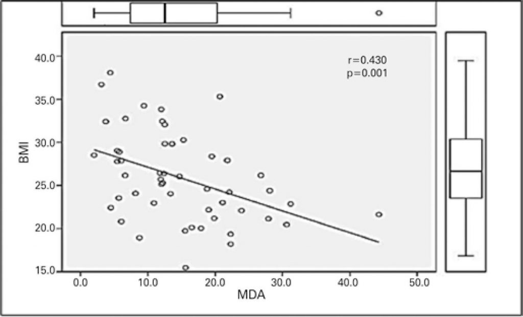 The mean age was 49.17±8.17 years. The highest percentage of malnutrition was according to arm muscle circumference (56.86%), followed by arm circumference (52.94%), triceps skin fold (50.98%), and body mass index (1.96%). The mean malondialdehyde level was 14.80±8.72μM/L, presenting a negative correlation with the body mass index for patients with liver cirrhosis according to IMC-Campillo values (p=0.001; r=-0.430). Low energy, carbohydrate, protein, vitamin A and E consumption were observed in more than 50% of subjects.