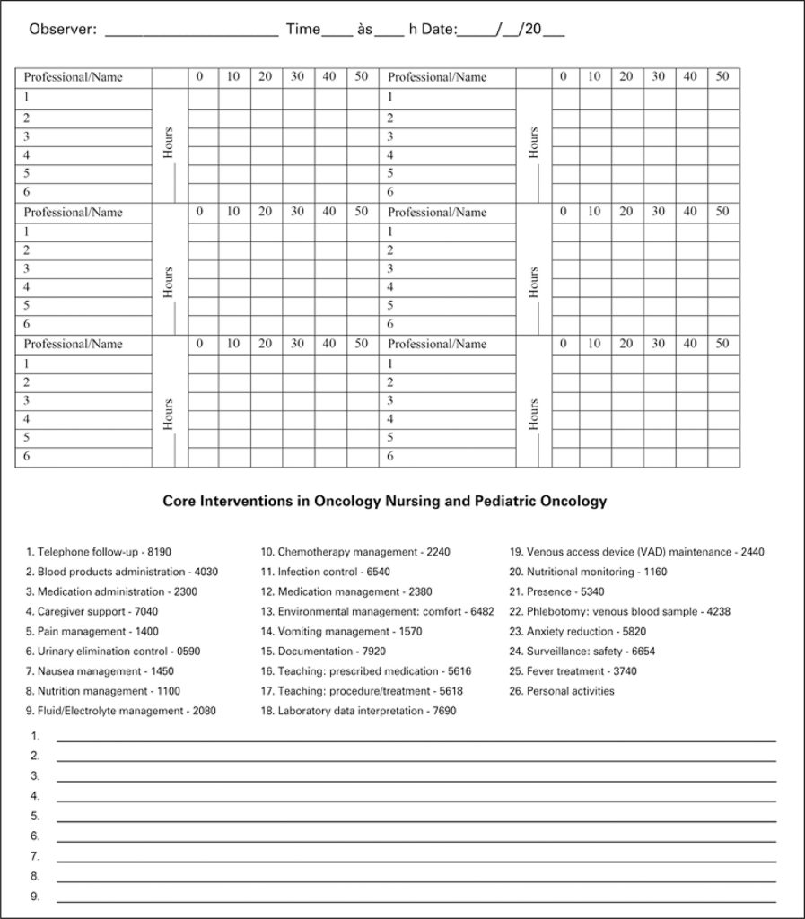 Construct and to validate an instrument for measuring the time spent by nursing staff in the interventions/activities in Outpatient Oncology and Hematology, interventions based on Nursing Interventions Classification (NIC), for key areas of Pediatric Oncology and Oncology Nursing.
