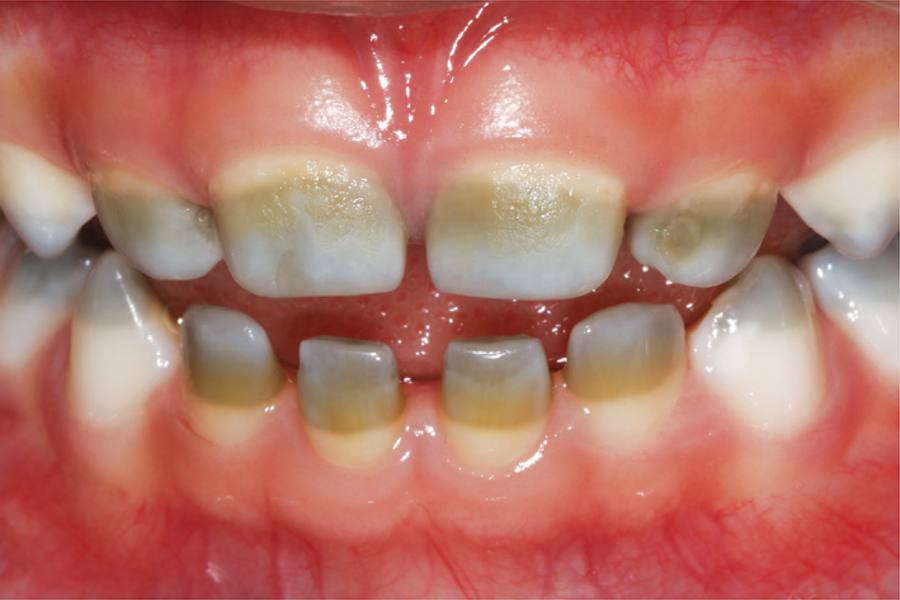 A 2-year-old girl was assisted at the pediatric clinic of the School of Dentistry at Araraquara, Universidade Estadual Paulista “Júlio de Mesquita Filho” (UNESP), accompanied by her father who was complaining about teeth pigmentation. The anamnesis showed that she was born in the 29th week of gestation, weighing 1,800g and with an Apgar score 2 in the first minute and 4 in the fifth minute, which required urgent measures of reanimation. The patient also had hypoxia, neonatal cholestasis, persistent arterial duct (PAD), interventricular communication (IVC), anemia and sepsis. The child remained hospitalized at the intensive care unit (ICU) for 40 days, and she underwent high-intensity phototherapy along with medication to reduce the production of bilirubin. The treatment was continued until normalization of clinical condition. Tests were carried out when the child was 3 months old and the results showed total bilirubin concentration equal to 14.9mg/dL; Glutamic-oxaloacetic transaminase (GOT) of 178U/L and glutamic-pyruvic transaminase (GPT) of 165U/L. At 1 year of age, the patient’s references were within normal ranges, and she did not present any motor or late cognitive sequelae.