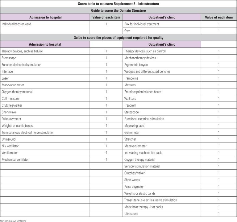 Five requirements composed the quality of care index in physical therapy, after application of the tool called Cause & Effect Matrix. The following requirements were assessed: physical therapist performance, care outcome indicator, adherence to physical therapy protocols, measure whether the prognosis and treatment outcome was achieved and Infrastructure.