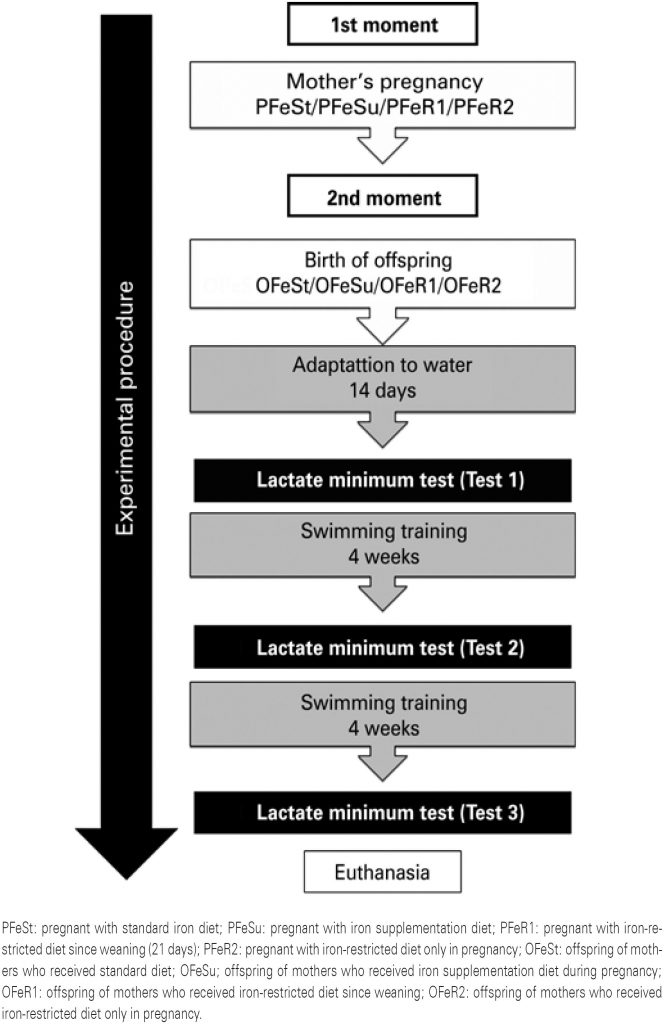 To evaluate if different concentrations of iron in diets during pregnancy would interfere in the aerobic and anaerobic performance of the offspring, observed during 8-week swimming training and measured by lactate minimum test.