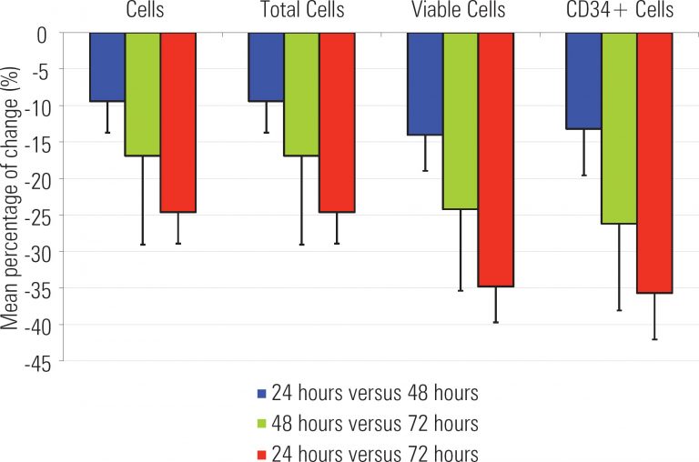 Means and medians of the number of nucleated cells, viable cells and CD34+ cells decreased significantly (p < 0.0001) as a function of the increased time between sampling and analysis, the difference between 24 and 48 hours being less than the difference between 24 and 72 hours. A linear correlation was found between the mean number of viable cells and CD34+ cells at the three moments of analysis. Contamination testing was negative in all samples.