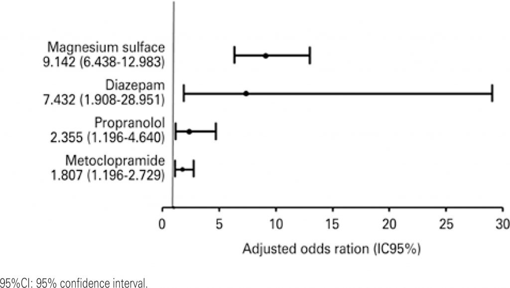 A total of 95.1% of patients were exposed to, at least, one potential drug interaction; in that, 91.7% 33.9% were related to, respectively, moderate and severe potential drug interactions. The patients were exposed, on average, on 69.2% of days they were in the intensive care unit. The main drugs involved in more severe drug interactions were magnesium sulfate, metoclopramide, propranolol and diazepam.