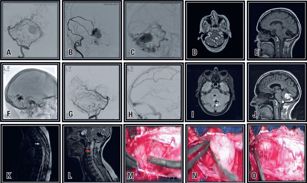 A 42-year-old woman presented with progressive paraparesis; after magnetic resonance imaging of the neuroaxis, an intramedullary tumor was observed at T4-T6 with a syringomyelia and dilatation of the venous system of the posterior fossa. Cerebral angiography revealed dural arteriovenous fistula (DAVF). To treat DAVF, the medullary tumor was surgically resected, and histopathological analysis confirmed the presence of an ependymoma (). The presence of DAVF associated with spinal tumors has not been reported in the literature to date, which makes this article unique.