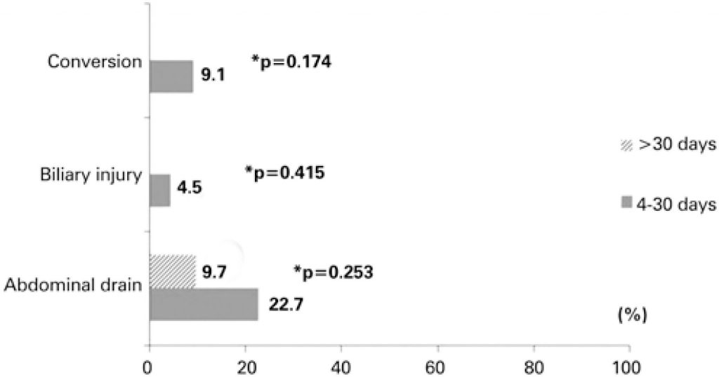 Approximately one-third of patients underwent the procedure between 4 and 30 days after endoscopic retrograde cholangiopancreatography. The conversion rate was 3.8%. The need for abdominal drainage and the finding of biliary tract injury after surgery were observed in 15.1% and 1.9% of patients, respectively. The length of stay was significantly shorter among patients undergoing surgery more than 30 days after endoscopic retrograde cholangiopancreatography. These patients had a median length of stay of one day, whereas the median length of stay in the group undergoing the procedure between 4 and 30 days after endoscopic retrograde cholangiopancreatography was 2 days.