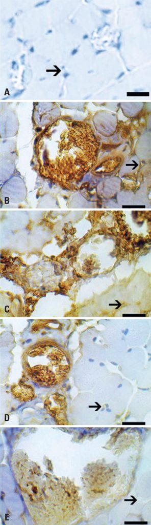 A total of 32 female Wistar rats underwent a crush injury and were randomly divided into four groups: Light Emitting Diode Group 2 and Control Group 2 (muscle collected 2 days after injury), and Light Emitting Diode Group 21 and Control Group 21 (muscle collected 21 days afterinjury). Light Emitting Diode Group 2 and Light Emitting Diode Group 21 received two and ten light emitting diode applications (630±20nm, 9J/cm2, 300mW), respectively, and the Control Group 2 and Control Group 21 did not receive any treatment. The function was evaluated by grasping test at four moments (pre-injury, 2, 10 and 21 post-injury days). The flexor digitorum muscle was collected for analysis of immunolocalization of vascular endothelial growth factor and redox parameters.
