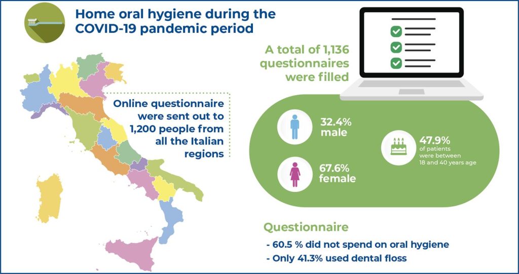 Returning to a European context, a study on 1,200 participants regarding oral hygiene habits revealed that 97% of Portuguese people used their toothbrush daily: 77% of women brush their teeth twice a day, but only 68% of men do.() Studies in a Polish population reported that approximately 80% performed oral hygiene once or twice a day() and 30% performed oral hygiene only once a day or less.() However, few studies on home hygiene habits on a population in conditions of isolation or rapid economic difficulty, such as the conditions brought about by the COVID-19 pandemic, are available. An Icelandic study evaluated the habits of 4,100 people between 2007 and 2009, which are the years of the country’s severe economic crisis. The results showed that previously, 96.8% of the participants performed daily oral hygiene and 40% used dental floss; however, during the crisis, the percentage increased to 97.4% and 43% respectively.() A significantly smaller study (300 participants) in Lithuania, which was performed during a period of economic reforms in the country, showed that the 35-44 year-old age group performed dental cleaning twice a day in 35% of cases, while in the 65-74 year-old age group, only 21% performed.() A previous study administered questionnaires in three different Italian universities (Palermo, Milan, Rome) and did not obtain particularly encouraging results especially on the use of dental floss among the Italian population.() Furthermore, epidemiological studies of this type seem to be aimed mainly at particular categories of patients (children, elderly, patients with particular systemic pathologies, etc.). Few data are also collected on the duration of hygiene maneuvers, lingual cleaning, and differences between a certain historical period and another. Thus, this study aimed to report the values on home oral hygiene habits during the pandemic and their difference in comparison with previous oral hygiene habits.