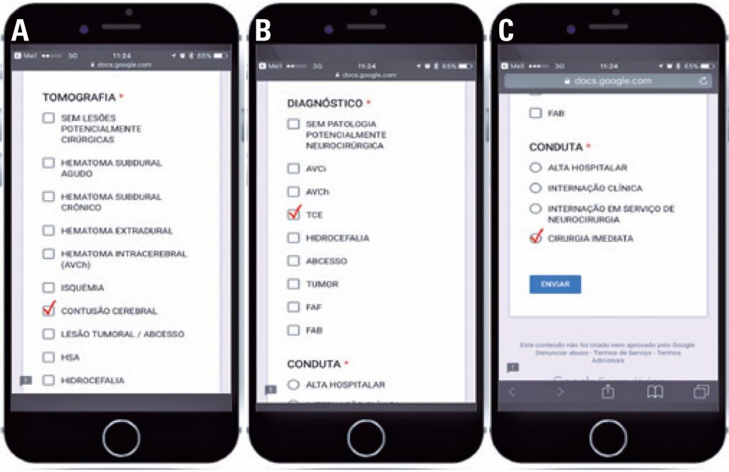 This is a retrospective and multicentric study. Data were collected from the medical records of patients subjected to real emergency neurosurgical evaluations and compared with assessments by neurosurgeons using smartphones to determine the feasibility of identifying changes in cranial computed tomography scans, potentially serious conditions of patients, and the need for transfer to reference centers.