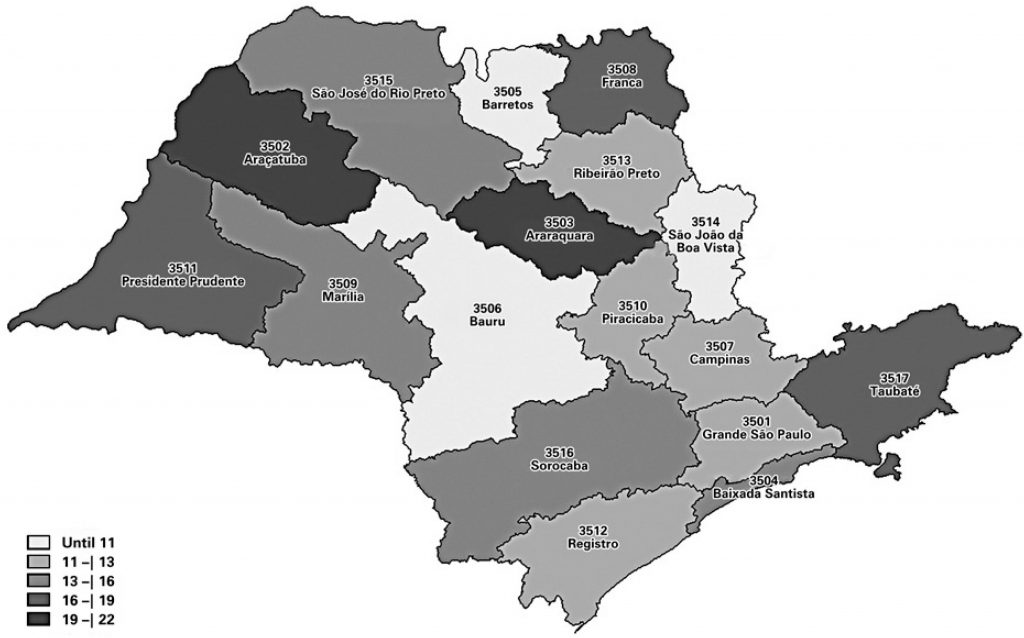 There was a 14.49% reduction in the amount spent on hospitalizations for ambulatory care sensitive conditions. There were reductions in the frequency of hospitalizations (−1.26) and hospital stay (−0.54), and an increase in the occurrence of deaths (8.02). The Regional Offices of Barretos, Taubaté and Araraquara showed an increase in expenses in the period, by 37.86%, 15.38% and 3.78%, respectively, while all other Regional Offices showed a reduction; in that, the most significant were in Bauru (−31.90%), São João da Boa Vista (−26.18%), Presidente Prudente (−21.00%) and São Paulo (−19.17%). The value of hospitalizations for ambulatory care sensitive conditions showed a strong and positive correlation with the variables frequency and hospital stay.