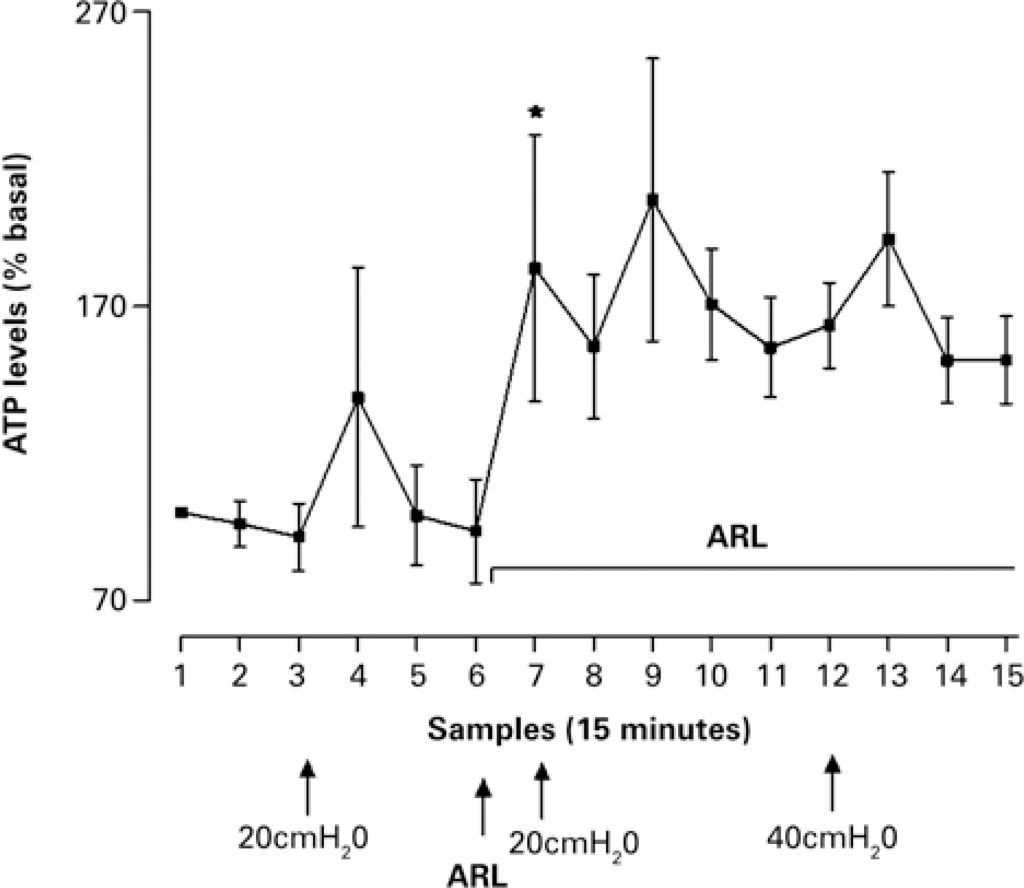 A microdialysis probe was transversally implanted in the dorsal half of spinal cord L6-S1 segment in female rats. Microdialysate was collected at 15 minutes intervals during 135 minutes, in anesthetized animals. Adenosine 5’-triphosphate concentrations were determined with a bioluminescent assay. In one group of animals (n=7) microdialysate samples were obtained with an empty bladder during a 10-minutes bladder distension to 20 or 40cmH2O with either saline, saline with acetic acid or saline with capsaicin. In another group of animals (n=6) bladder distention was performed and the microdialysis solution contained the ectonucleotidase inhibitor ARL 67156.