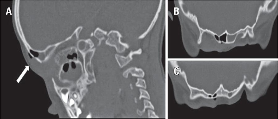 A 5-year-old boy with previous history of frontal sinus fracture, 2 years ago, with conservative treatment and no current surgical follow-up. Upon admission, he had sudden onset of fever, severe swelling over the right eyelid and supraciliary region, and painful ocular movement. Physical examination showed no other alterations, therefore, excluding neurological compromise. Laboratory tests revealed raised inflammatory markers. For staging the extent of inflammation and exclude intracranial complications a computed tomography scan of the head and orbits was performed and revealed right frontal and periorbital swelling extending to postseptal area without optic nerve involvement. In addition, we observed subcutaneous emphysema around a break in the continuity of the anterior wall of frontal sinus table and a process of acute pansinusitis with air-fluid levels involving maxillary, ethmoid, sphenoid and frontal sinuses; there was no abscess formation. We admitted the diagnosis of orbital cellulitis and facial subcutaneous emphysema due to pansinusitis. Facial subcutaneous emphysema has been reported as an acute complication of head trauma.(–)However, in this case, it was caused by a late complication of past bone fracture, probably triggered by an acute process of frontal sinusitis, which is a rare complication.