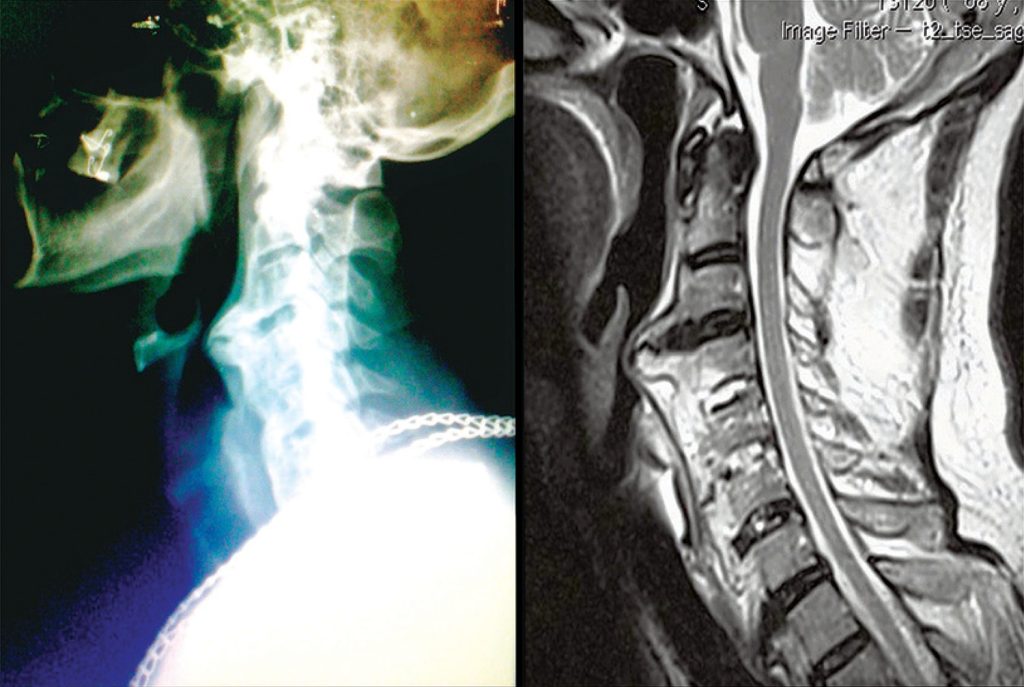 Lateral cervical X-ray and T2-weighted sagittal magnetic resonance. We observed an extensive calcification in front of vertebral bodies of C2 to C6 in topography of anterior longitudinal ligament. Esophagus and airways present a posterior compromising, which determine a stenosed segment that difficult orotracheal intubation at time of surgical procedure