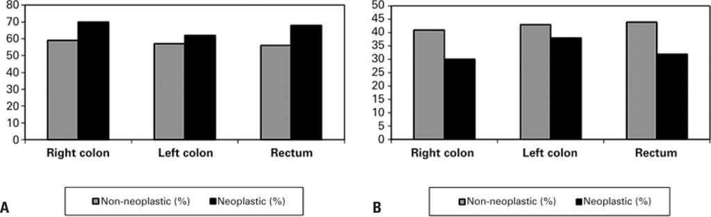 Tissue samples from neoplastic and non-neoplastic colorectal tissues were obtained from 64 operated patients who had colorectal carcinoma with no distant metastases. Expressions of heparan sulphate, chondroitin sulphate, dermatan sulphate and their fragments were analyzed by electrospray ionization mass spectrometry, with the technique for extraction and quantification of glycosaminoglycans after proteolysis and electrophoresis. The statistical analysis included mean, standard deviation, and Student’st test.