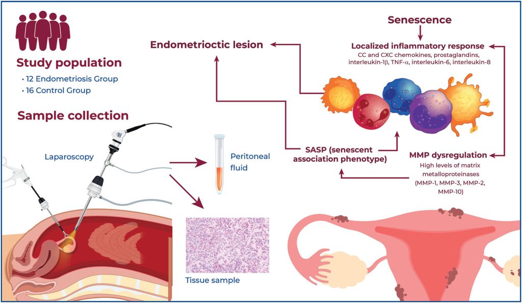 To investigate the roles of cellular senescence and dysfunctional extracellular matrix metalloproteinases (MMPs) in perpetuating chronic inflammation and facilitating the establishment of endometriotic lesions. By analyzing the MMP activity in the endometrial tissue and peritoneal fluid, we aimed to obtain novel insights into the molecular mechanisms underlying endometriosis-related pathophysiology.