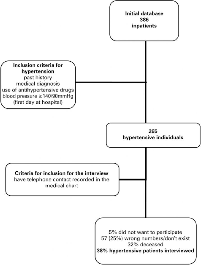 This was an exploratory study with 265 hypertensive patients admitted to a medical inpatients unit of a university hospital. Data were collected in an interview over the telephone. The level of significance was set as p<0.05.