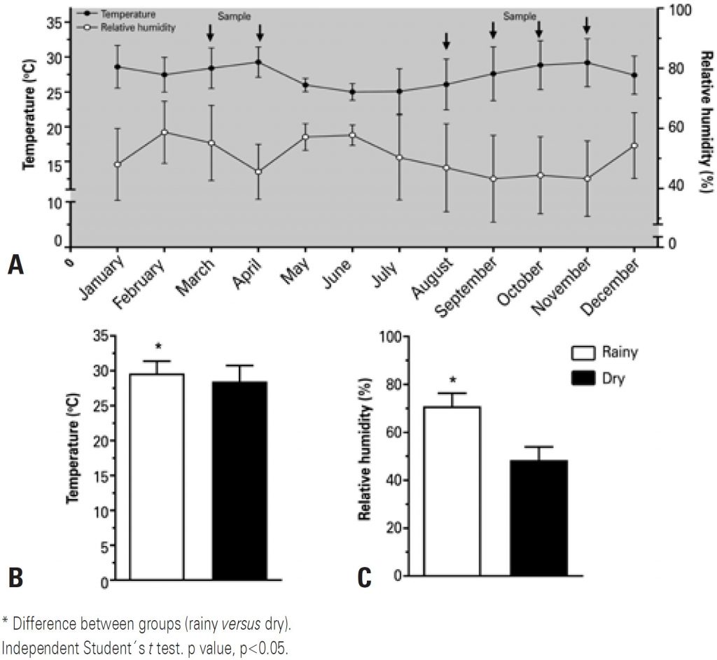 This sample comprised 82 adolescents aged 15 to 18 years, who were submitted to exercise-induced bronchospasm assessment on a treadmill and outdoors, during the rainy and the dry season. Anthropometric variables, sexual maturity and forced expiratory volume in the first second were analyzed. Air temperature and humidity, decline in forced expiratory volume in the first second (%) and frequency of bronchospasm were compared between seasons using the independent Student’s t test, the Wilcoxon and McNemar tests, respectively. The level of significance was set at p<0.05.