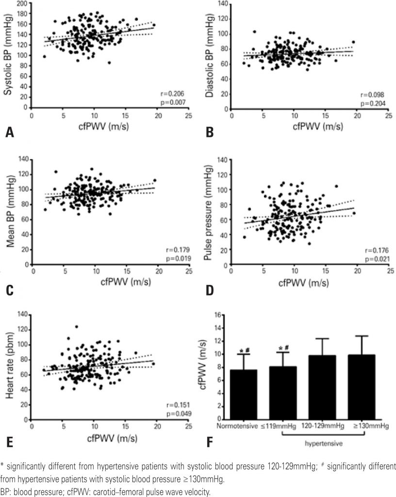 Hypertension was associated with higher carotid-femoral pulse wave velocity, regardless of sex, age, ankle-brachial index, body mass index, walking capacity, heart rate, or comorbidities (ß=2.59±0.76m/s, b=0.318, p=0.003). Patients with systolic blood pressure ≥120mmHg had higher carotid-femoral pulse wave velocity values than normotensive individuals, and hypertensive patients with systolic blood pressure of ≤119mmHg (normotensive: 7.6±2.4m/s=≤119mmHg: 8.1±2.2m/s 120-129mmHg:9.8±2.6m/s=≥130mmHg: 9.9±2.9m/s, p<0.005). Sympathovagal balance was not associated with hypertension (p>0.05).