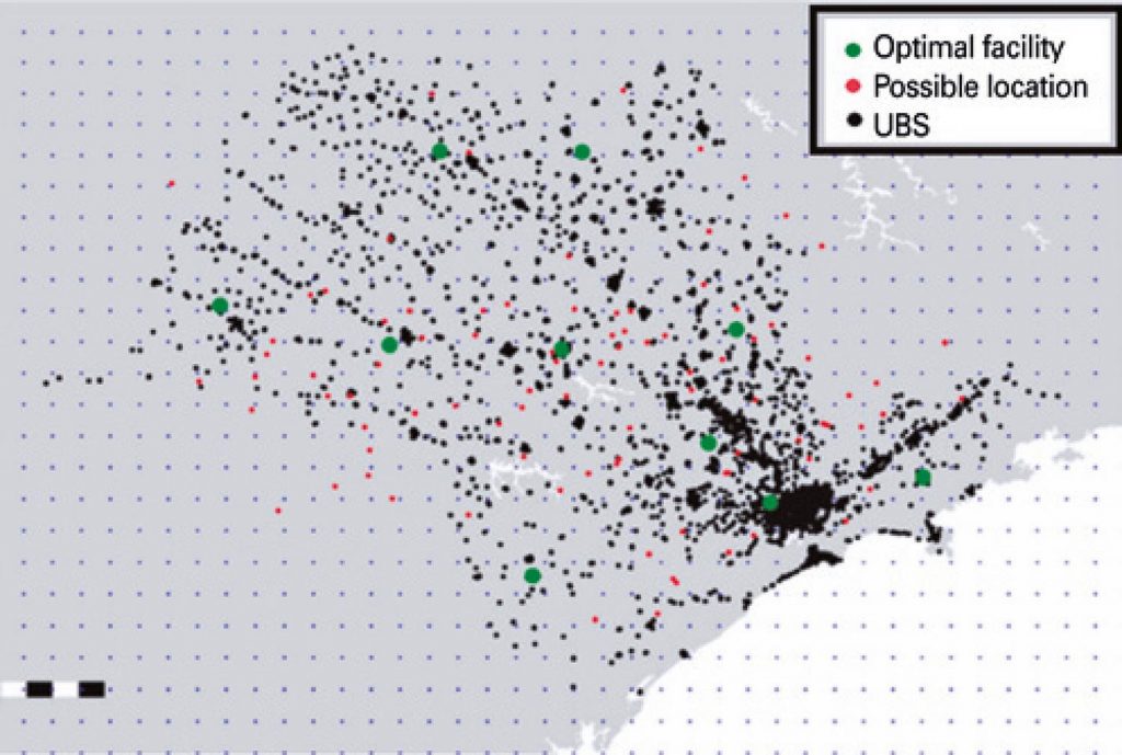 Using a fixed number of supply facilities, ten as a constraint, the p-median approach allocated three facilities near the state capital (the area with the highest concentration of Primary Health Care Units), while remaining facilities were spread throughout the west of the state. A second round of tests assessed the impact of fixed costs alone on optimization, ranging from 71 optimal locations with a fixed unit cost to six optimal locations at a cost 300-fold higher. This finding was relevant to decision-making, since it encompassed scenarios in which only the final number of facilities or only the budget was known. A third set of simulations contemplates an intermediate scenario.