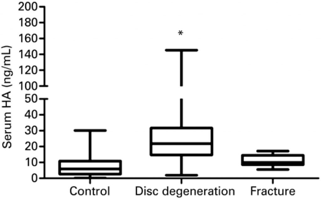 Hyaluronic acid can be a biomarker for intervertebral disc degeneration, because hyaluronic acid levels were higher only in sera of patients with intervertebral disc degeneration.