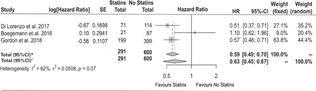 A total of 195 articles were initially identified, but only four met the inclusion criteria and were selected for the meta-analysis. A total of 955 patients, 632 on the new antiandrogens only group, and 323 on the new antiandrogens + statins group, were analyzed. In all four studies the combination therapy (new antiandrogens + statin) was well tolerated, regardless of which new antiandrogens were used. Neither the type of statin nor the doses and duration of use were well specified in the studies. The combination therapy in metastatic castration-resistant prostate cancer was associated with an overall survival improvement, and a 46% reduction in death (hazard ratio of 0.54; 95%CI 0.34-0.87; p<0.01) in multivariate analysis.