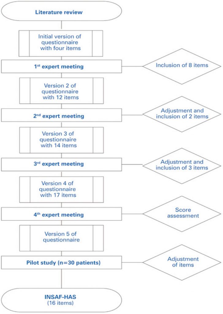 Literature review yielded 30 studies, out of which 13 factors associated with hypertension and cardiovascular disease control and complications were selected. Once the initial version of the tool named INSAF-HAS was obtained, four expert meetings were held, each leading to instrument improvement until a final consensus was reached. In the pilot study, INSAF-HAS was applied to 30 patients with a diagnosis of hypertension for applicability pretest; adjustments were made and the final version of INSAF-HAS obtained.