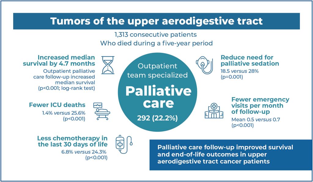 Outpatient follow-up by a specialized palliative care team was associated with longer survival and better end-of-life care. These findings highlight the potential benefits of integrating palliative care earlier in the treatment of patients with upper aerodigestive tract cancers.