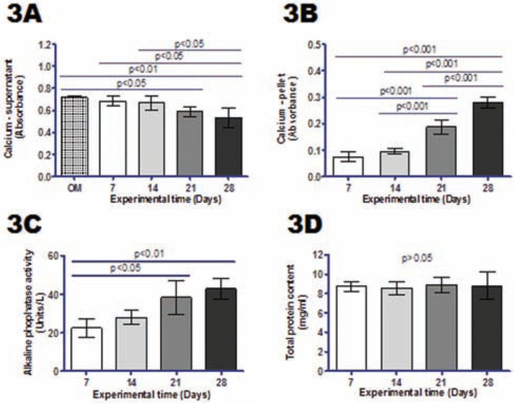 Primary cultures of human umbilical blood cord adherent cells were expanded in vitro until passage 2 and seeded for osteodifferentiation study. Morphological (light microscopy), cytochemical (Von Kossa’s method), and functional analyses (calcium level, alkaline phosphatase activity, and total protein content in cell culture) were carried out 7, 14, 21, and 28 days after the osteoinduction protocol.