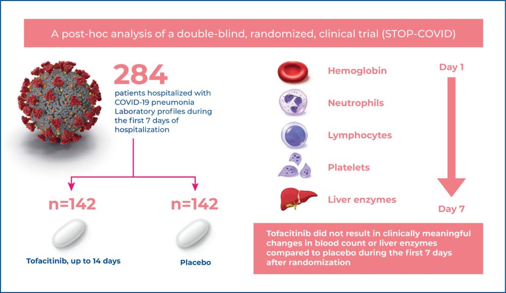 In patients with COVID-19 pneumonia, the use of tofacitinib compared to placebo did not result in clinically meaningful changes in blood counts or liver enzymes over the first 7 days after randomization.