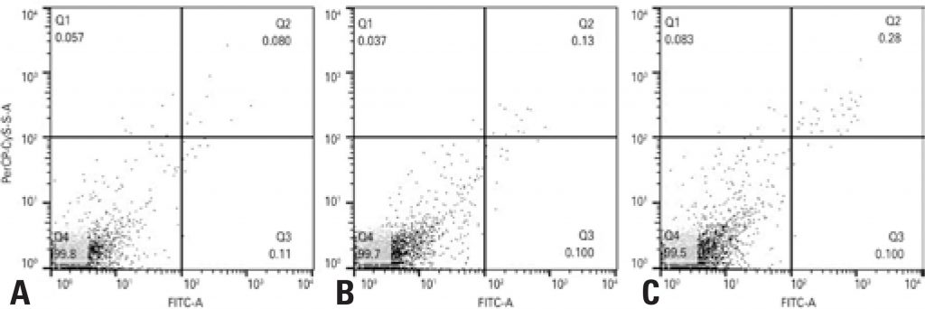 The Irradiated Groups (0.5 and 1.0J/cm2) showed an increased cell proliferation (p<0.05) when compared to the Control Group, however no significant difference between the two energy densities was observed. Flow cytometry revealed a percentage of viable cells higher than 99% in all groups.