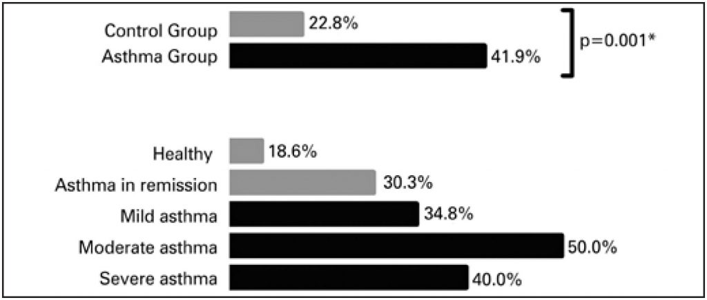 A cross-sectional study was carried out with parents of children with medical diagnosis of asthma (mild, moderate and severe), followed up at an outpatient referral center for childhood asthma in the Southern region of Brazil (Asthma Group). Parents of children with asthma in remission and healthy children were also selected (Control Group). The Newcastle Asthma Knowledge Questionnaire (NAKQ) questionnaire was applied in both groups.