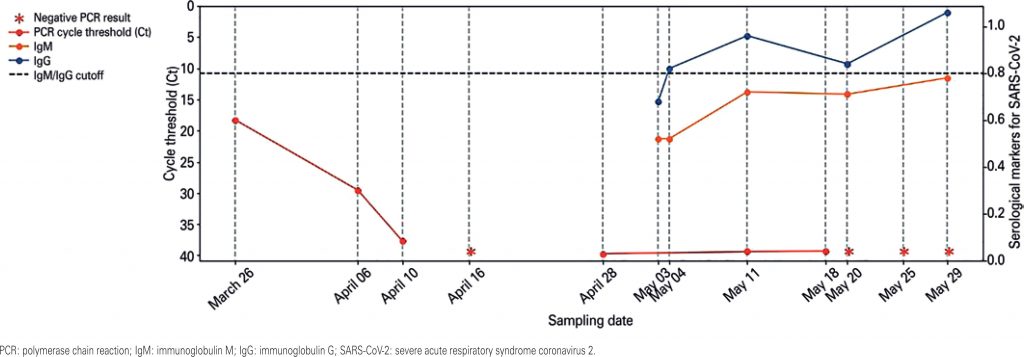 During the COVID-19 pandemic, a case of a long-term persistence of SARS-CoV-2 infection (from March 26 to May 20, 2020) was identified at a private hospital in São Paulo, SP, Brazil. The long-term positivity for SARS-CoV-2 in reverse transcriptase polymerase chain reaction tests of a patient diagnosed with COVID-19 suggests, at least part of patients who recovered, may still carry and transmit the SARS-CoV-2 virus. This fact emphasizes the importance of having at least two negative reverse transcriptase polymerase chain reaction test results for SARS-CoV-2. Serological assays were not particularly helpful in the case described, since the patient had very low antibodies titers at the end of the follow-up period. Low viral loads may not be detected by current molecular methods, leading to wrong conclusions regarding viral clearance.