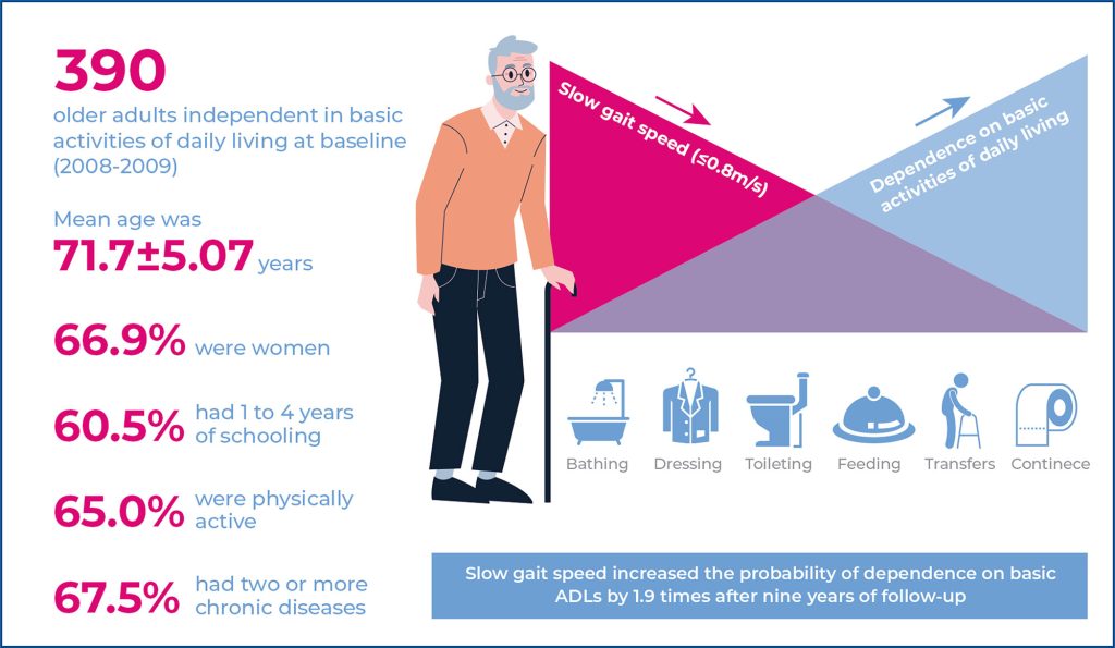 Slow gait speed is a predictor of functional dependence, constituting an important variable for screening functional decline.