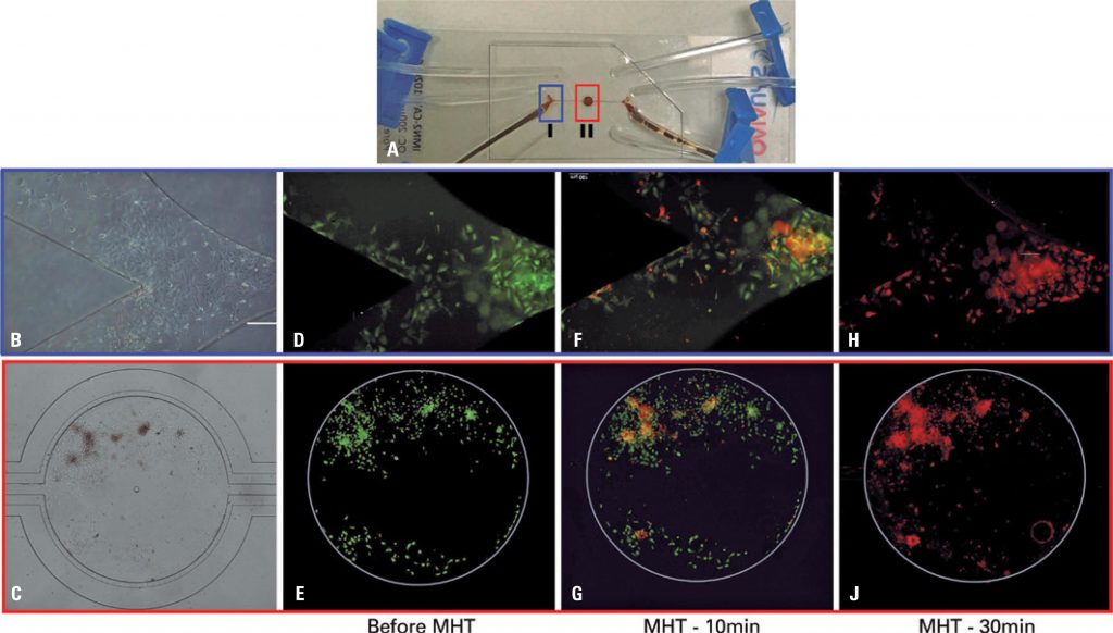 Magnetic nanoparticles when submitted to the alternating magnetic field (300 Gauss and 305kHz) produced a mean value of the specific absorption rate of 115.4±6.0W/g. The 3D culture of C6 cells evaluated by light field microscopy imaging showed the proliferation and morphology of the cells prior to the application of magnetic hyperthermia therapy. Fluorescence images showed decreased viability of cultured cells in organ-on-a-Chip by 20% and 100% after 10 and 30 minutes of the magnetic hyperthermia therapy application respectively.