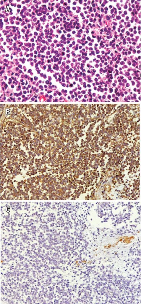 (A) High degree urethral sarcoma; (B) Immunohistochemical analysis that revealed strong positivity of vimentin; (C) Urethral tumor also showing positivity for desmin
