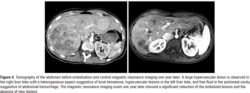 Hepatocellular adenoma is a rare benign tumor that was increasingly diagnosed in the 1980s and 1990s. This increase has been attributed to the widespread use of oral hormonal contraceptives and the broader availability and advances of radiological tests. We report two cases of patients with large hepatic adenomas who were subjected to minimally invasive treatment using arterial embolization. One case underwent elective embolization due to the presence of multiple adenomas and recent bleeding in one of the nodules. The second case was a victim of blunt abdominal trauma with rupture of a hepatic adenoma and clinical signs of hemodynamic shock secondary to intra-abdominal hemorrhage, which required urgent treatment. The development of minimally invasive locoregional treatments, such as arterial embolization, introduced novel approaches for the treatment of individuals with hepatic adenoma. The mortality rate of emergency resection of ruptured hepatic adenomas varies from 5 to 10%, but this rate decreases to 1% when resection is elective. Arterial embolization of hepatic adenomas in the presence of bleeding is a subject of debate. This observation suggests a role for transarterial embolization in the treatment of ruptured and non-ruptured adenomas, which might reduce the indication for surgery in selected cases and decrease morbidity and mortality. Magnetic resonance imaging showed a reduction of the embolized lesions and significant avascular component 30 days after treatment in the two cases in this report. No novel lesions were observed, and a reduction in the embolized lesions was demonstrated upon radiological assessment at a 12-month follow-up examination.