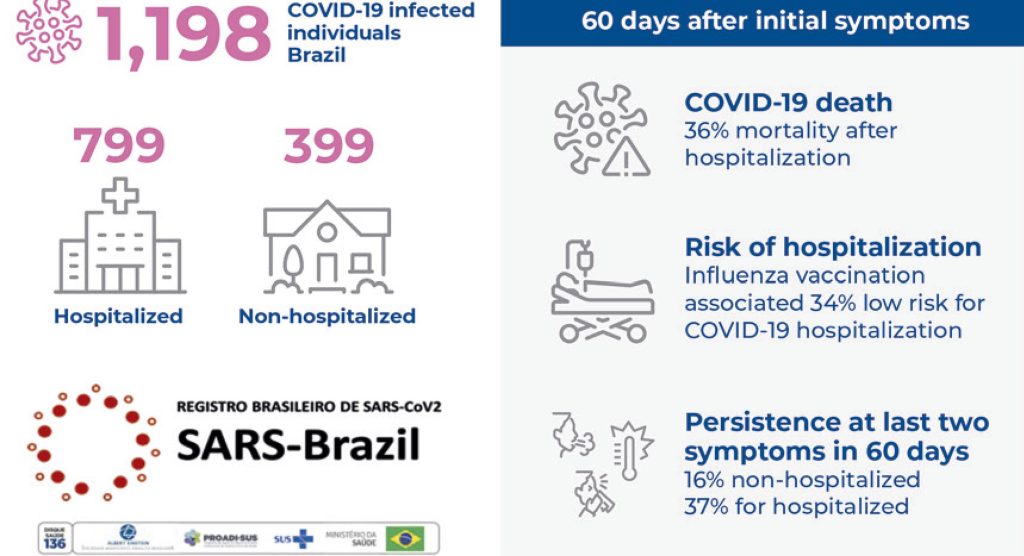 Out of 1,198 patients enrolled in the study, 66.7% were hospitalized. A total of 289 patients died (1 [0.3%] non-hospitalized and 288 [36%] hospitalized). At 60 days, patients non-hospitalized during admission had more persistent symptoms (16.2%) compared to hospitalized (37.1%). The COVID-19 severity variables associated with the persistence of two or more symptoms were increased age (OR= 1.03; p=0.015), respiratory rate at hospital admission (OR= 1.11; p=0.005), length of hospital stay of more than 60 days (OR= 12.24; p=0.026), and need for intensive care unit admission (OR= 2.04; p=0.038).