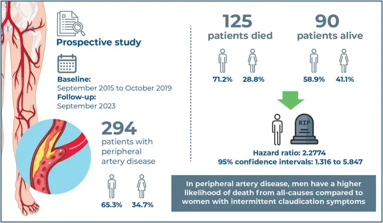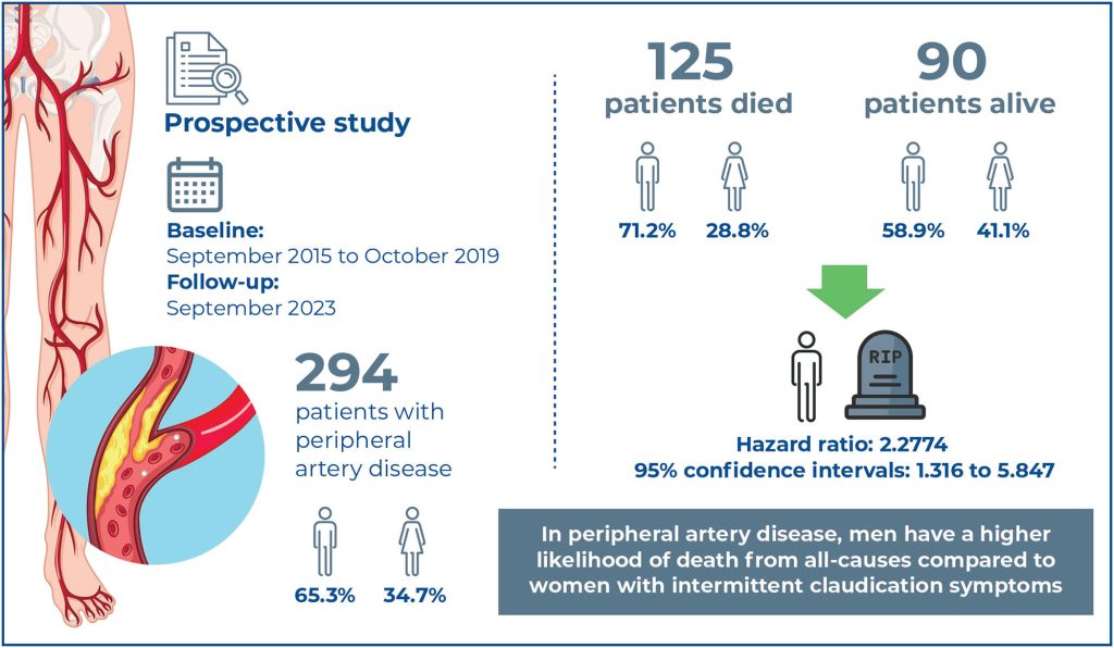 In patients with peripheral artery disease, men with intermittent claudication symptoms exhibit a higher risk of all-cause mortality compared to women. Future research should focus on identifying sex-specific risk factors associated with mortality in this population. Such insights are critical for developing targeted interventions aimed at reducing mortality, particularly among men with intermittent claudication in low- and middle-income countries.
