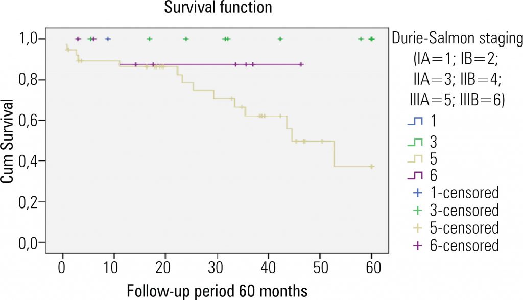 The median age was 58.5 years. Anemia was observed upon diagnosis in 87% of patients, hypercalcemia in 38%, and creatinine levels higher than 2 mg/dL in 19%. M protein was detected in 85.7%. The five-year survival rate was 74.6%. Multivariate analysis showed statistical significance for Durie-Salmon staging (p = 0.037). The International Staging System and immunoglobulin type did not correlate significantly with survival of the group.