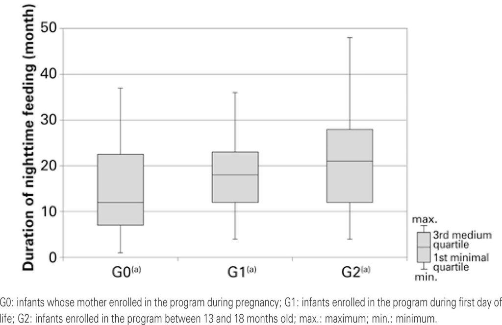: Cross-sectional study involving 465 children who were divided into 3 groups: infants whose mothers joined the program during pregnancy (n=50); infants enrolled in the program during the first year of life (n=230); and infants enrolled in the program between 13 and 18 months old (n=185). The χ2 and Kruskal-Walis tests (95% confidence interval) were used to assess the relationship among variables.