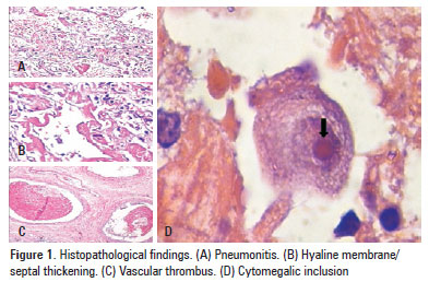 OBJECTIVE: To analyze the histopathological lung findings of four fatal cases of the 2009 H1N1 influenza pandemic and their correlation with clinical and epidemiological characteristics. METHODS: Descriptive data from medical records of four patients who died in the Intensive Care Unit of a university hospital in 2009. Nasopharyngeal aspirate specimens were collected from the patients and were analyzed by real-time polymerase chain reaction. Lung biopsy was performed post mortem; a score of intensity for pathological changes was applied. RESULTS: Three patients had positive real-time polymerase chain reaction (although all of them had a clinical diagnose of influenza H1N1). The main histopathological changes were: exudative diffuse alveolar damage with atelectasis; varying degrees of alveolar hemorrhage and edema, necrosis and sloughing of the respiratory epithelium in several bronchioli; and thrombus formation. One of the patients (the pregnant one) presented histopathological findings of cytomegalic inclusion. CONCLUSION: The pulmonary histopathological findings in patients with fatal 2009 H1N1 influenza pandemic disclosed intense alveolar damage and hemorrhage and severe bronchiolitis. A co-infection with cytomegalovirus was described in the pregnant patient.