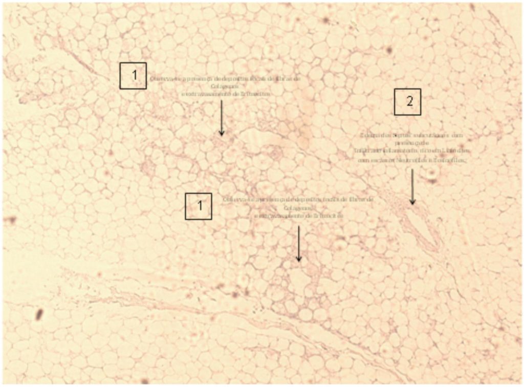 Focal collagen fibers storage and extravasation of erythrocytes (1). Subcutaneous septal edema with inflammatory infiltration (2)