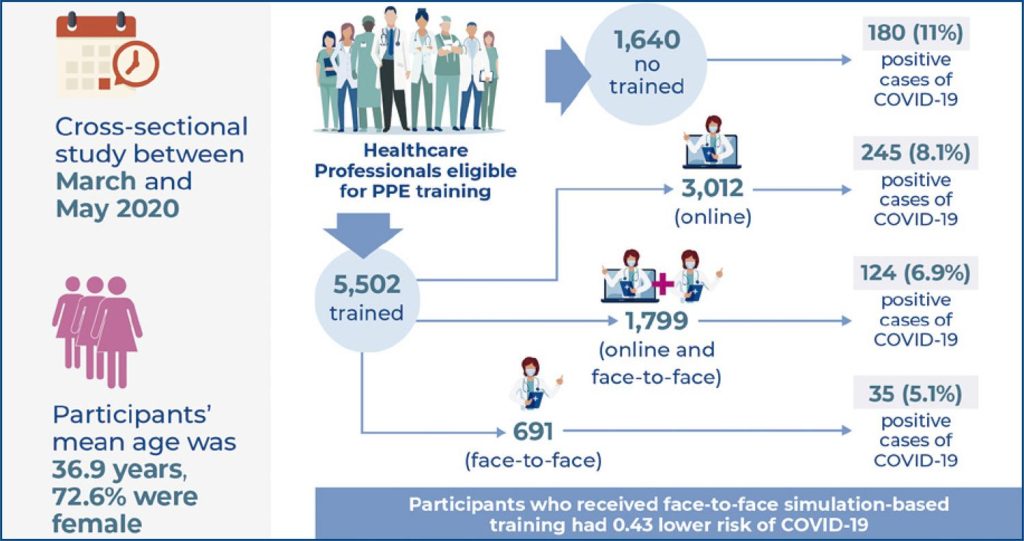 We found lower odds of infection in participants who underwent face-to-face simulation-based training.۪