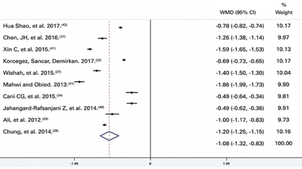Fifteen trials involving 2,325 participants were included. Meta-analysis revealed considerable heterogeneity (I2>97%; p<0.001), reduction in glycated hemoglobin (-1.07%; 95%CI: -1.32; -0.83; p<0.001), glucose (-29.91mg/dL; 95%CI: -43.2; -16.6; p<0.001), triglyceride (19.8mg/dL; 95%CI: -36.6; -3.04; p=0.021), systolic blood pressure (-4.65mmHg; 95%CI: -8.9; -0.4; p=0.032) levels, and increased HDL levels (4.43mg/dL; 95%CI: 0.16; 8.70; p=0.042).