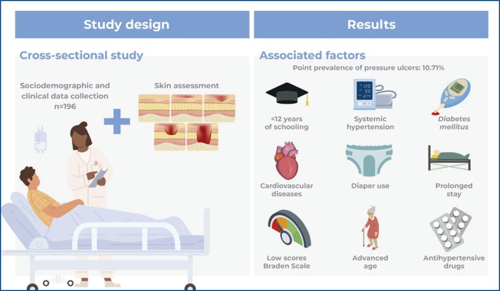 The point prevalence of pressure ulcers was 10.71% and was significantly associated with less than 12 years of schooling (p=0.0213), use of antihypertensive drugs during hospital stay (p=0.0259), diagnosis of systemic hypertension (p=0.0035), and diabetes mellitus. Lower scores on the Braden scale (p=0.0001) were positively associated with the presence of pressure ulcers. Furthermore, cardiovascular disease (p=0.0267) and diaper use (p=0.0001) were associated with the presence of pressure ulcers. Moreover, they were also associated with prolonged hospital stay, advanced age, less than 12 years of schooling, use of antihypertensive drugs, hypertension, diabetes, and lower Braden scale scores.
