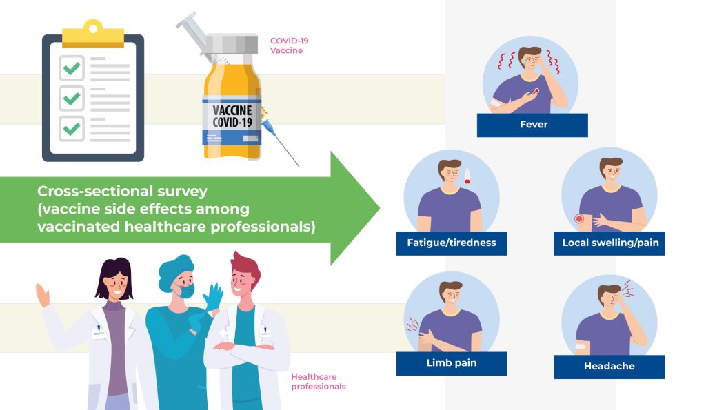 So far, at least 18 different severe acute respiratory syndrome coronavirus-2 vaccines have been approved. Until October 2022, 12.8 billion doses had been administered all over the world. Vaccination of high-risk groups and healthcare professionals was initially prioritized. This cross-sectional survey aimed to investigate the occurrence of vaccine side effects, as well as the incidence of COVID-19 among vaccinated healthcare professionals.