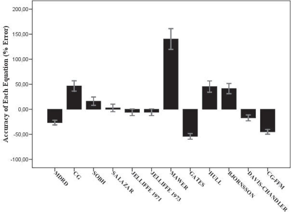 In renal disease, Cockcroft-Gault’s formula and the diet modification equation are not precise in severely obese patients (precision: 40.9 and 33.4, respectively). Sobh’s equation showed no bias in the general group or in two subgroups. Salazar-Corcoran’s and Sobh’s equations showed no bias for the entire group (Bias: −5.2, 95% confidence interval (CI) = −11.4, 1.0, and 6. 2; 95%CI = −0.3, 12.7, respectively). All the other equations were imprecise for the entire group.