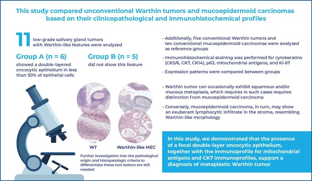This study aimed to analyze the clinicopathological and immunohistochemical profiles of unconventional Warthin tumors and mucoepidermoid carcinomas.